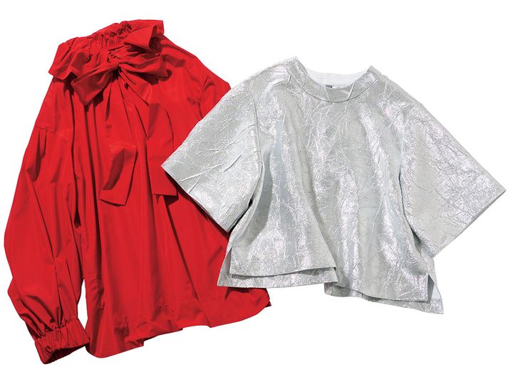 〈右〉艶感のあるジャガード素材を使用したメタリックトップス。トップス[撥水・防汚加工]¥29,000〈左〉リボンの結び方1つで表情も自由自在。リボンブラウス[撥水・防汚加工]¥35,200(ともにティーチ)