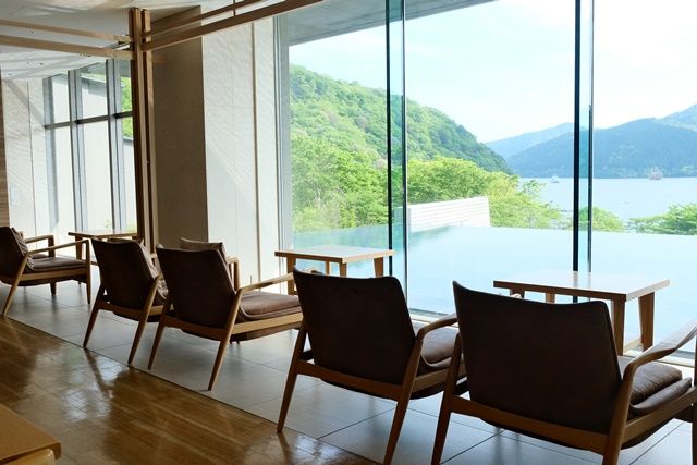 のんびり滞在を楽しむため、箱根登山バスを利用して15時に「はなをり」に到着。エントランスをくぐってロビーへと足を踏み入れると、早速芦ノ湖と箱根の山々が目に飛び込んできました。