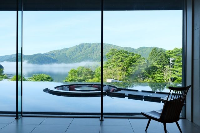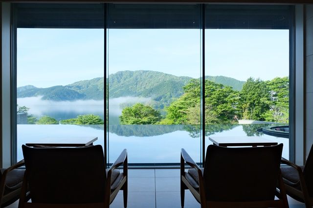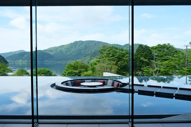 「はなをり」の最大の魅力のひとつが、芦ノ湖の風景がスクリーンのように広がるロビー。ロビーの外側に設けられた水盤テラスと芦ノ湖と空とが一体となって、唯一無二の景観をつくり上げているのです。