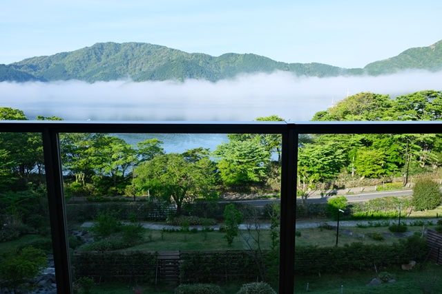 翌朝6時すぎに目が覚めると、窓の外に雲海が立ち込めた芦ノ湖の風景が。「芦ノ湖ってこんなふうになるんだ!」という驚きとともに、しばしその神秘的な光景に見とれました。