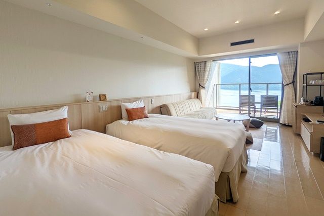 今回宿泊したお部屋は、バルコニーから芦ノ湖の眺望が楽しめる「スタンダードルーム」。箱根の自然と調和するシンプルなインテリアながらも上質感があり、入った瞬間ほっと心がほどけるようなくつろぎを覚えます。