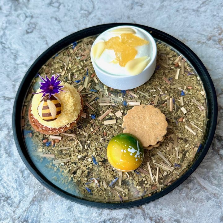 上段:白いんげん豆と和三盆ムース、ういきょうのヴェリーヌ、よもぎのティラミス