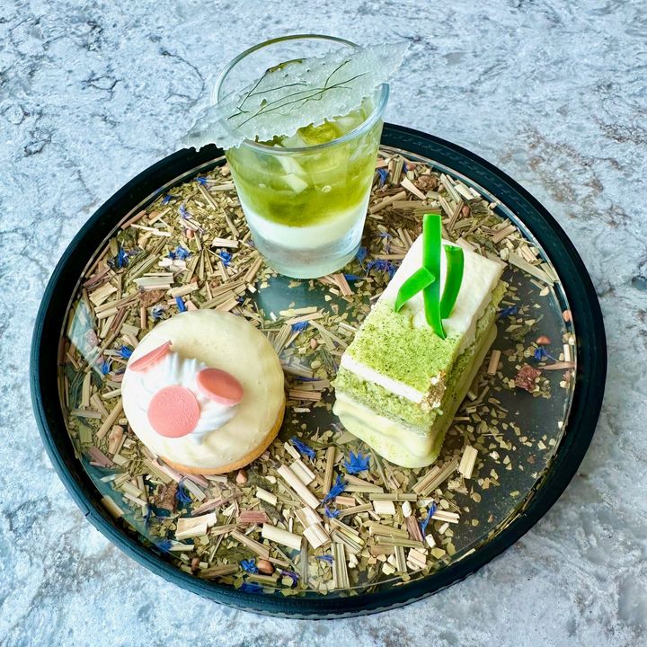 初夏の爽やかさをイメージしたアフタヌーンティーになっており、輝く新緑や初夏に向かってまばゆさを増してゆく日差しを、緑やオレンジのコントラストで表現。カットした甘夏に練乳とフロマージュブランのクリームを合わせた「甘夏のクレームダンジュ」や、濃厚なマスカルポーネとよもぎの香りがハーモニーを奏でる「よもぎのティラミス」、ういきょうの葉・茎・株元までまるごと使った「ういきょうのヴェリーヌ」、ペーストした白いんげん豆の羊羹を合わせた「白いんげん豆と和三盆ムース」など、厳選した農園から仕入れる野菜や柑橘の爽やかな味わいを楽しめます。