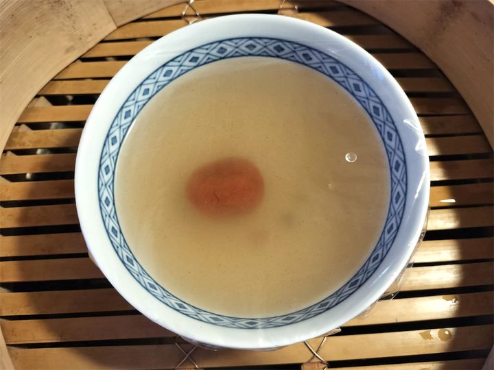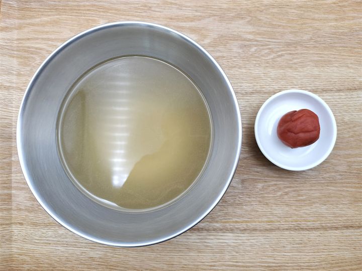 1. 耐熱容器に梅干しと常温のかつおだし300mlを入れます。
