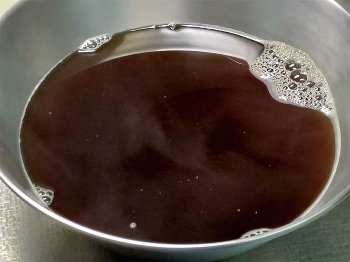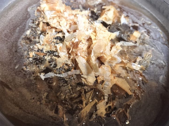 5. 鍋にかつおだし200ml、みりん、濃口しょうゆを入れて火にかけ、沸いたら火を止めてかつおぶしを入れ、沈んだら濾します。