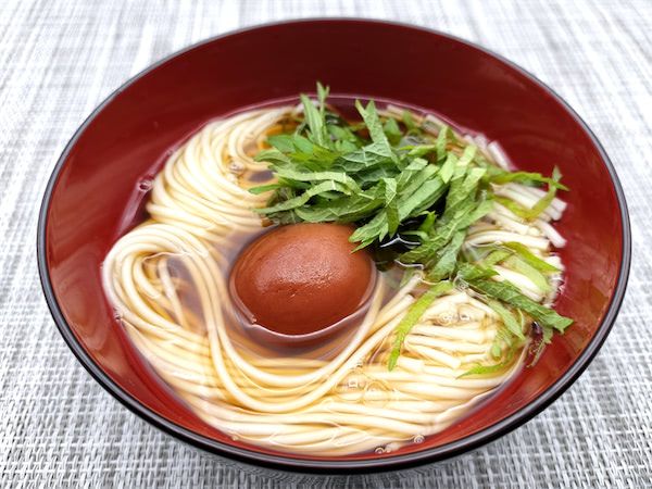 7. そうめんの水を切り、端を切り落として器にきれいに盛り付け、梅を乗せます。6の合わせだしをかけ、青じそを乗せて出来上がりです。