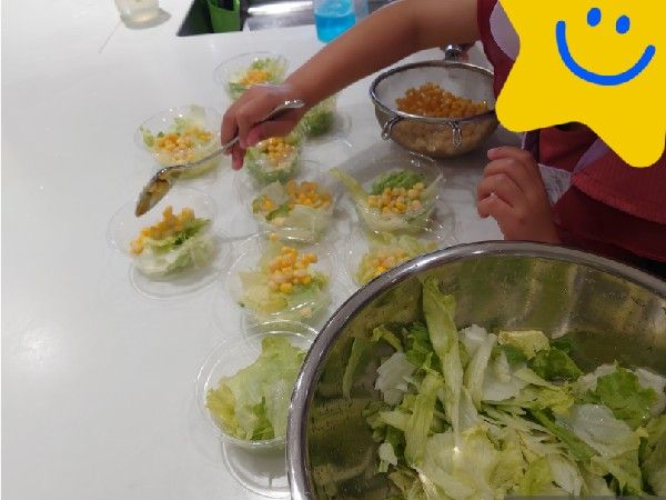 女の子たちはサラダ作りに挑戦していました。レタスもすごい量あるのですが、それを手で小さくちぎって洗ってボールに入れていました。和気あいあい楽しそう!キュウリはスライサーでスッスーと上手に出来ていました。ホールコーンは水気を切って、人数分のカップにサラダを取り分けセッティングしていました!