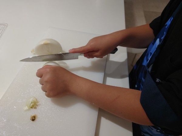 ハヤシライス作りに立候補した子どもは包丁を使い玉ねぎの皮を剥いて薄切りにします。うちのコは家で包丁を持たせたことはありません。やってみたい!お手伝いする!と言ってくれますが、中々させてあげれていません。皮を手でむいたり簡単なものは挑戦してもらい楽しそうな姿を家で見ていますが、一緒に包丁を持って料理!となると汚れる!、自分でやったほうが早い、どっちがする!と下の子とケンカになったり、どっと親が疲れるので…⋯積極的にしたことはないのです。