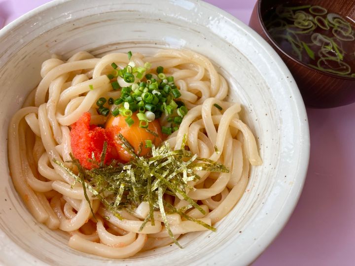 明太釜玉うどんのたまごと明太子も入れてさらに贅沢に...