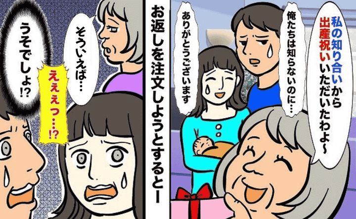 お礼を言って受け取ったものの、相手は夫ですら知らない人たち。夫婦ともに「ありがたいね」と内祝いを返そうとしたそのとき、義母が口を出してきたのです……!