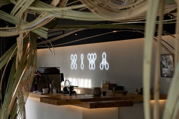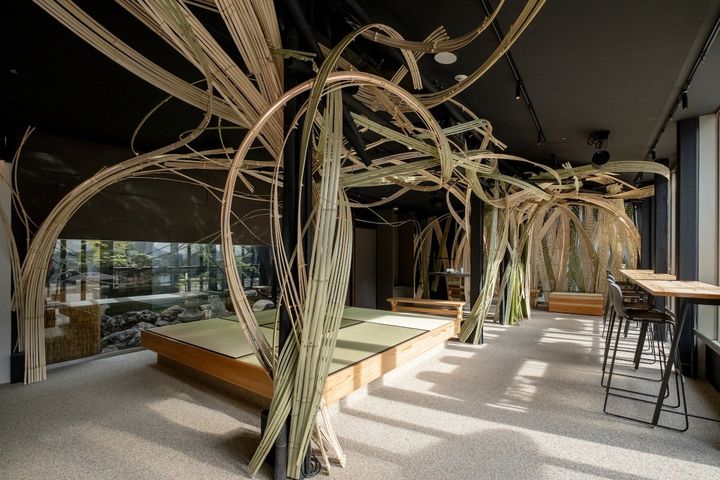 店内に足を踏み入れると、まず目を引くのは、まるで全体がひとつのアート作品のようにデザインされた空間。その中心にあるのが、しなやかに曲がる竹でつくられた大きなオブジェです。