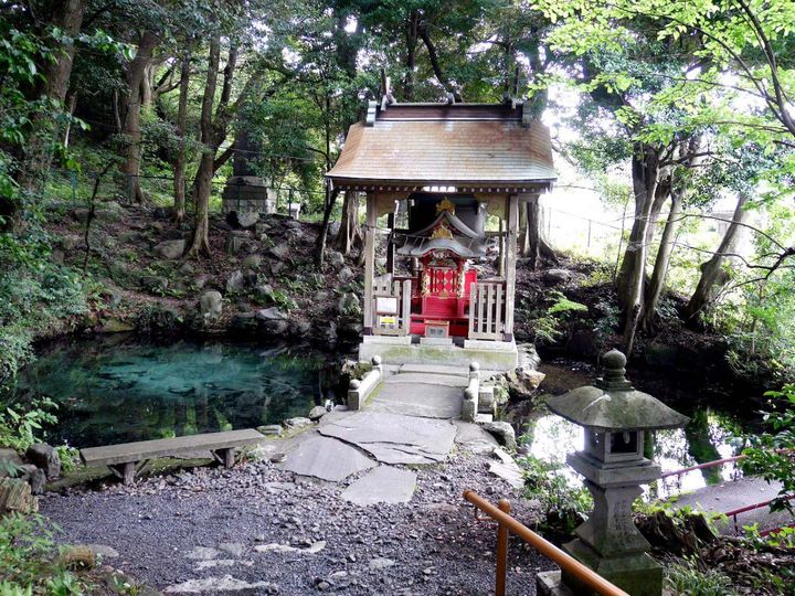 本殿への参拝を終え横の道を降りていくと、森のなかにエメラルドグリーンの泉が見えてきます。社記には「霊玉が天から降りてきて、水が湧き出て泉となった」と記されており、パワーの源ともいえる湧水です。