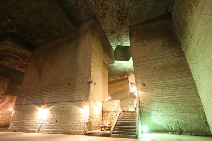 大正8年(1919)から昭和61年(1986)にかけて掘り下げられた一部を公開した地下神殿のような「大谷資料館」。ほのかな暗闇の中に現れた約2万㎡の採掘空間は、思わず立ち尽くし、息をのむほど圧巻の光景が広がります。ところどころライトアップされていて天井も高いので、地下の閉塞感というよりむしろ開放感に満ちた独特な世界観となっています。
