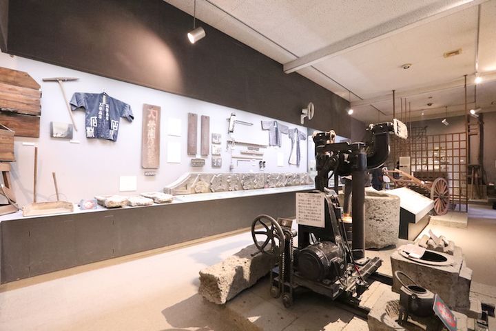 地下採掘場の見学の後は地上の資料展示室へ。手彫り採掘で使用した道具や石の運搬に使用された機具をはじめ、機械掘りの装置なども展示しています。大谷石とほかの国産石の違いをふれて比べることもできますよ。