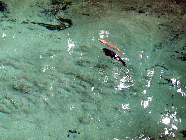 透明度が高いため膝くらいの浅い泉に見えますが、実はなんと水深1.5メートル! 運がよければ、鯉が湧水の上を通り、まるで宙に浮いているかのような神秘的な光景を見ることもできますよ。