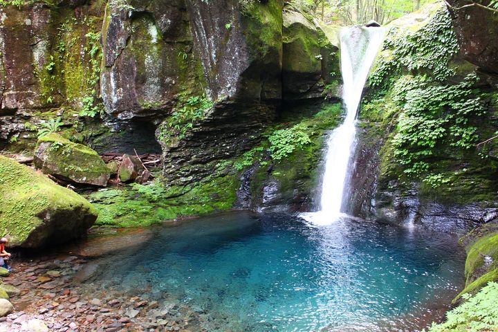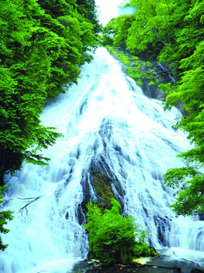 東斜面のスッカン沢は、コバルト色の滝壺が神秘的です。スッカン沢の源流は火口のカルデラ湖。火山由来の鉱物を含むため水は鮮やかなコバルト色で、「スッカンブルー」とも呼ばれています。沢づたいに設けられた片道約2㎞の遊歩道を歩けば、3つの滝を間近に望むことができます。滝の風を全身に浴び、涼しさいっぱいです。