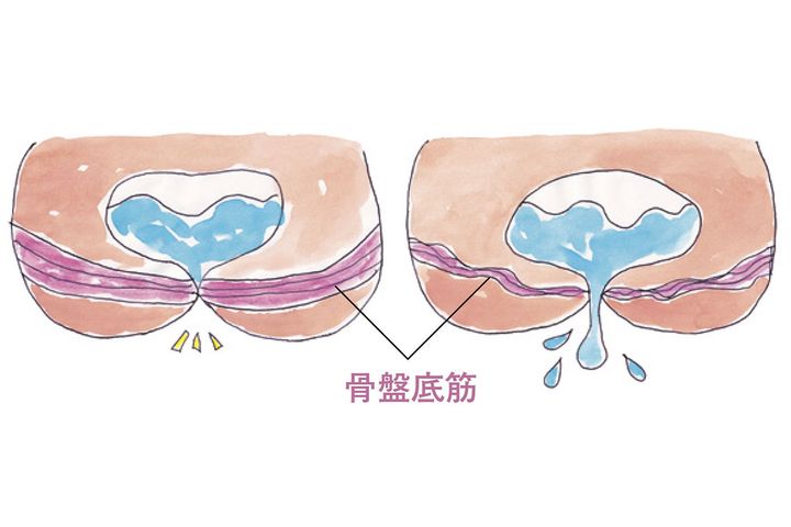 正常な骨盤底筋は膀胱や尿道を支えて、腹圧がかかっても尿道をギュッと締めて尿がもれないように働きます。緩んだ骨盤底筋は尿道を締められず、尿がもれます。