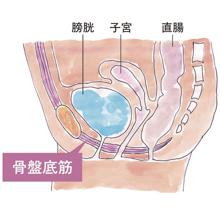 骨盤底筋は、骨盤の底で膀胱・子宮・直腸などの臓器を支える重要な筋肉。骨盤底筋が衰えて緩むことで尿道・膣・肛門を締める機能が下がり、尿失禁や膣からのお湯もれ、便失禁、骨盤臓器脱などトラブルを招きます。