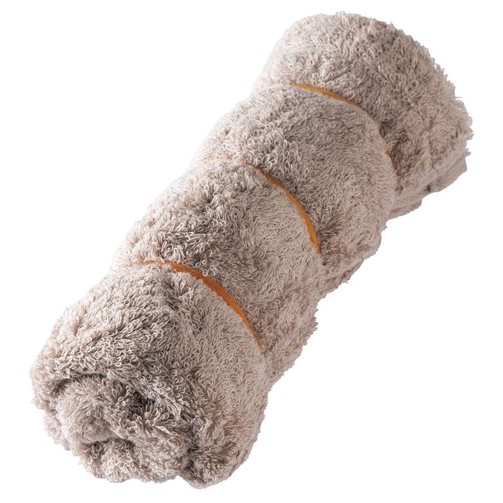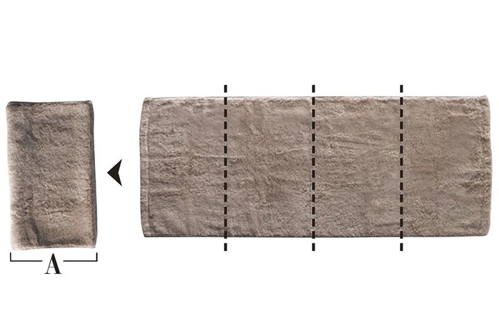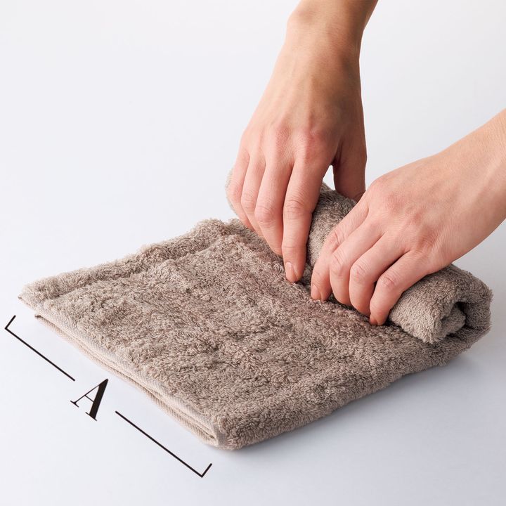 用意するのは家庭によくある薄手のフェイスタオル1枚と輪ゴムだけ。タオル棒の完成サイズは長さ20cm前後、直径の目安は4~5cm。