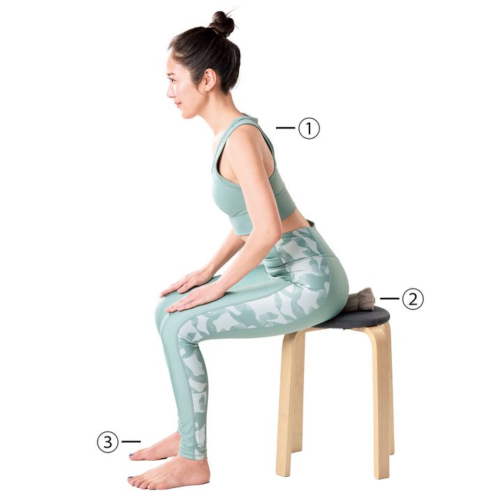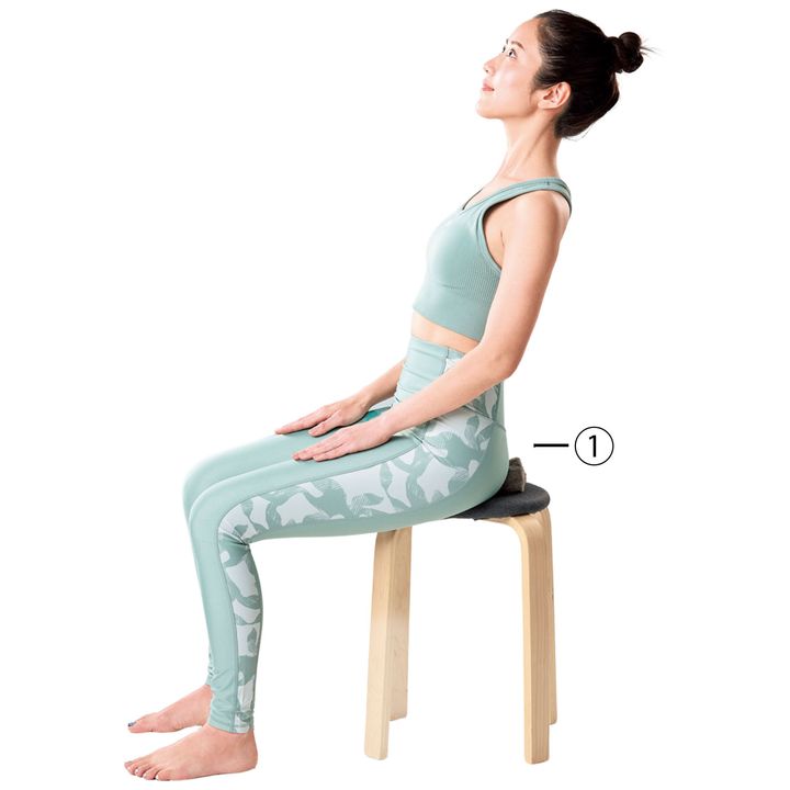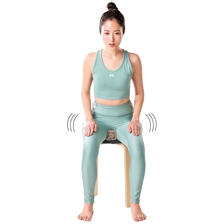 タオル棒を椅子の座面に縦に置き、タオルが膣口と肛門の間に当たるように調整して座る。背筋を伸ばして上体を前傾させます。