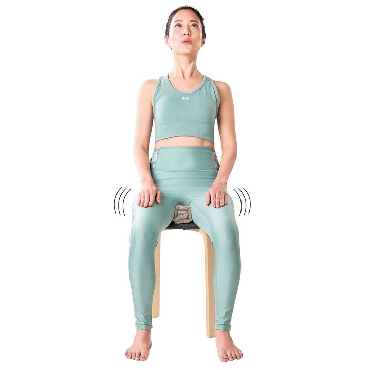 骨盤底筋を意識しながらお尻を左右に揺らして膣と肛門を締め、5秒かけて息を吐く。吐ききったら力を緩めて、ゆっくり息を吸う。