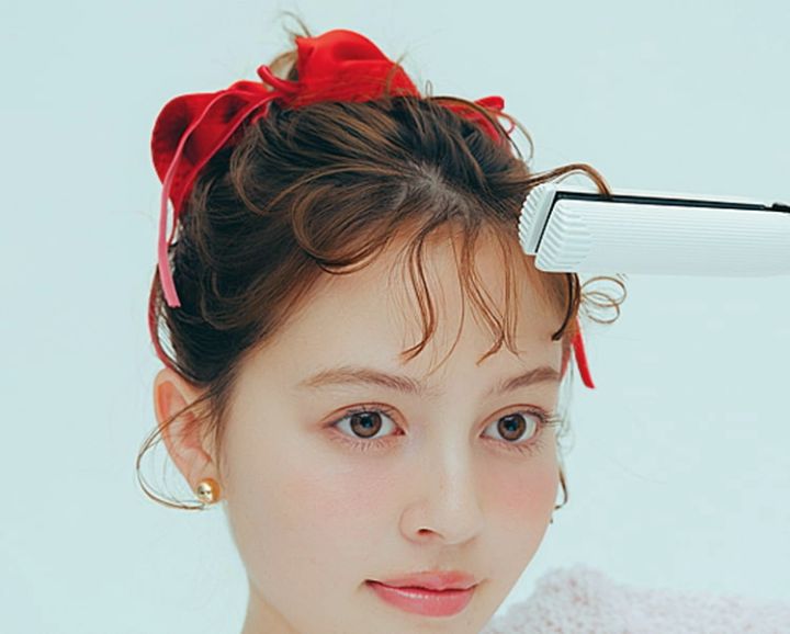 シュシュの存在感にあわせてガーリーな雰囲気を増すため、細めのストレートアイロンで前髪をくりくりとした強めのカールに。