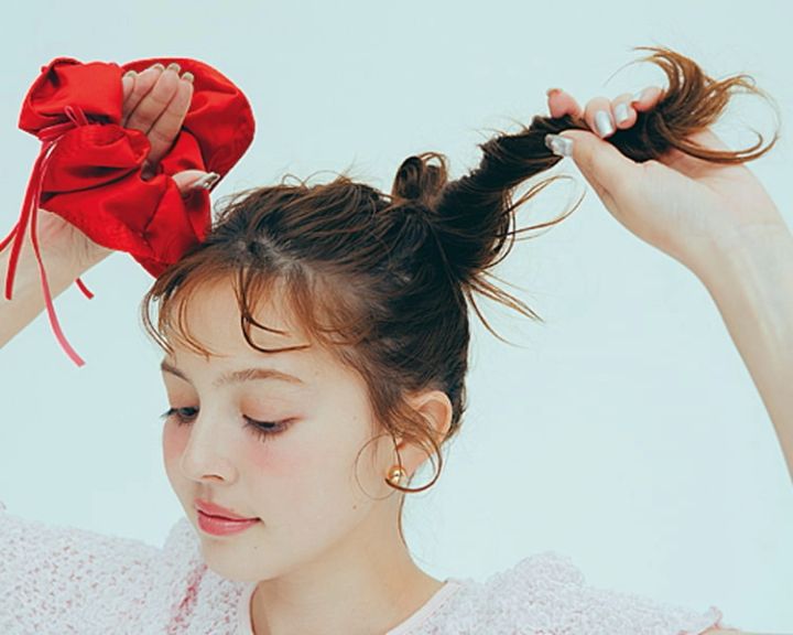 髪全体をシュシュが正面から見える位置でわっかだんごに。毛先を結び目に巻きつけ、おだんごをつくりシュシュでとめる。