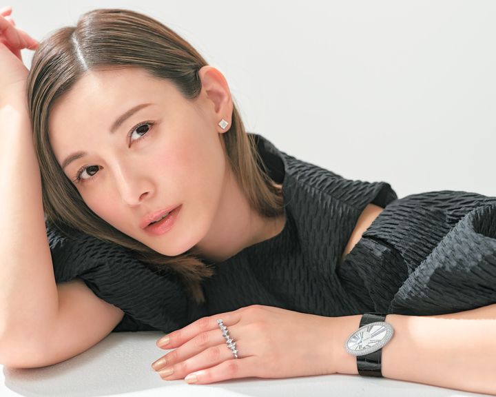 義母から譲り受けたカルティエのアンティークウォッチをつけると、自然とエレガントな立ち居振舞いに。GRAFF のダイヤモンド スタッドイヤリングは3人目を出産したときに。モードにふれるミオハルタカのリングも。
