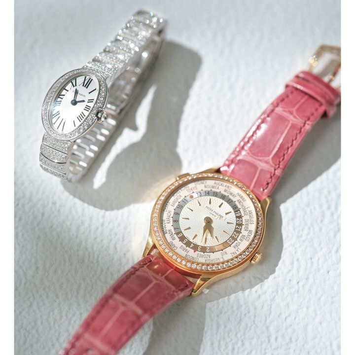 出産や誕生日、子供の入学など思い出が刻まれた、ジュエリーウォッチ。パテック フィリップのコンプリケーションはデニムなどでカジュアルダウンして。カルティエのベニュワール ウォッチは華やかなシーンに。