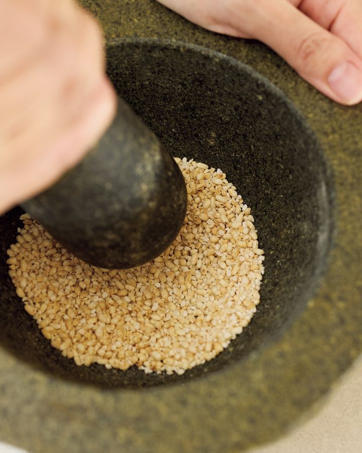 香ばしく煎った米は、粗くつぶしてから和えて! 調味料の汁気を吸いやすくなり、ほかの具材ともなじみやすくなる。