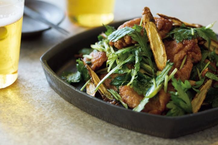 黒酢だれがしみた豚肉とごぼうに、春菊と三つ葉の香りが絶妙にからむ! ごぼうは気泡が出なくなるまで揚げてパリパリに。