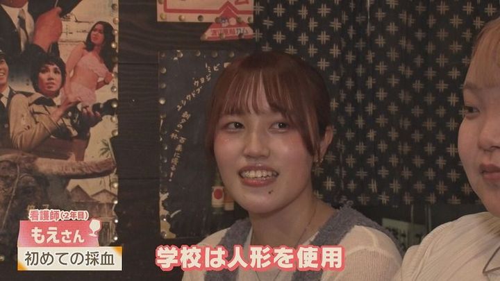 もえさん:「採血は、最初先輩の腕でやるんです」堀アナ:「そうなんだ!今でも覚えている?学校で練習してきたんだろうけど…」
