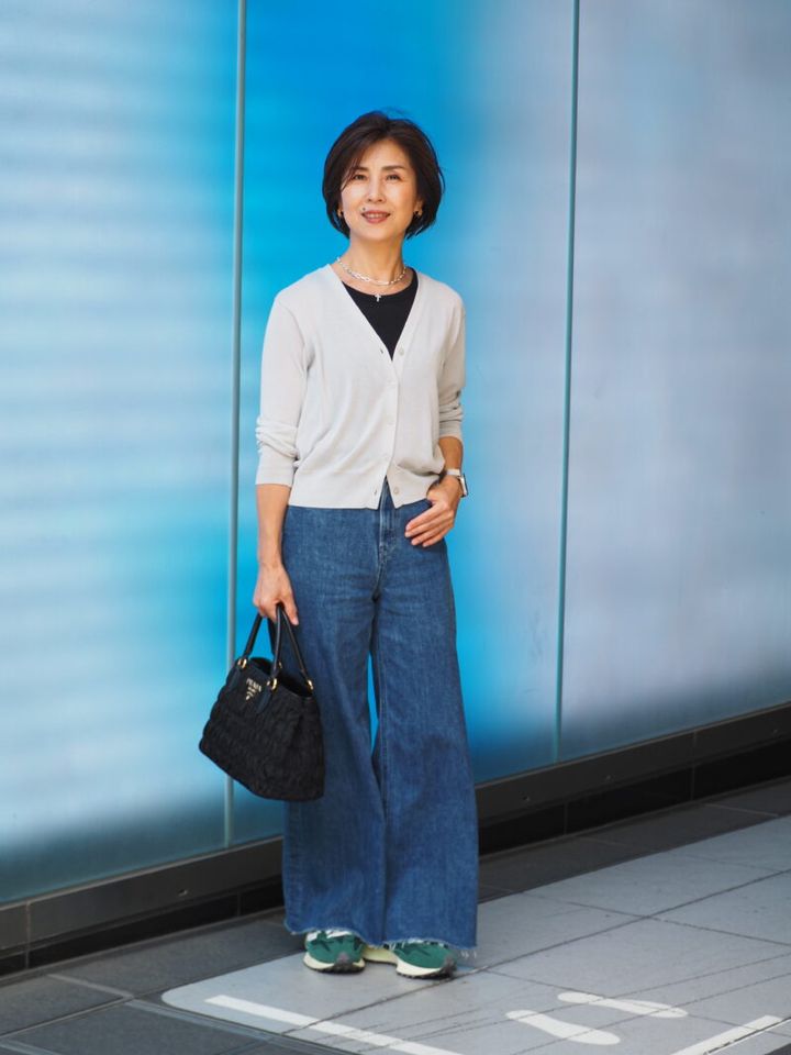 「じんわりと汗ばむ梅雨時季は、おしゃれと快適さを意識したコーディネートで乗り切りたい」。そんなshizukaさんが着ていたのは「ユニクロ」のシアーカーディガン。タンクトップの上にさらっと重ねて軽やかに。切りっぱなしのワイドデニムとスニーカーを合わせることで、アクティブな街歩きスタイルの完成です!