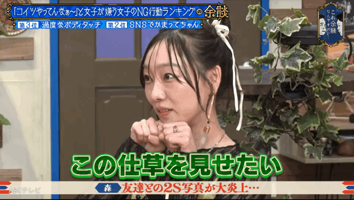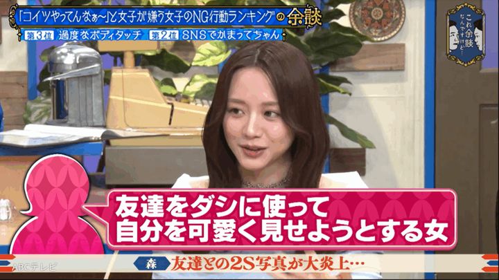 女子が嫌う女子の行動としてSNSの写真が話題になる中、「私、友達との2ショットあげて大炎上したんですよ」と話し始めた森香澄。「普通に今日も楽しかったみたいな感じで、友達がいて、友達の後ろにこうやって…」と、須田を友達に見立て、その時のポーズを実演。「もうほぼこれ。この写真をあげたんですよ。そしたら『自分のビジュだけよければいいのか?』『友達をダシに使って自分を可愛く見せようとする女』みたいな感じでめっちゃ炎上して、何万も『いいね』付いてて」と炎上事件を振り返った。