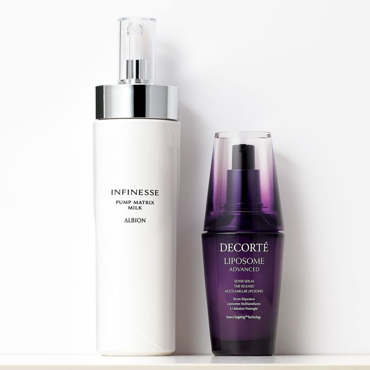 左:セラムの次に。いきいきとしたハリ弾力肌へ。アンフィネス パンプ マトリクス ミルク 200g ¥7,700(アルビオン)右:多重層バイオリポソームが美容成分を適所にデリバリー。リポソーム アドバンスト リペアセラム50ml ¥12,100(コスメデコルテ)