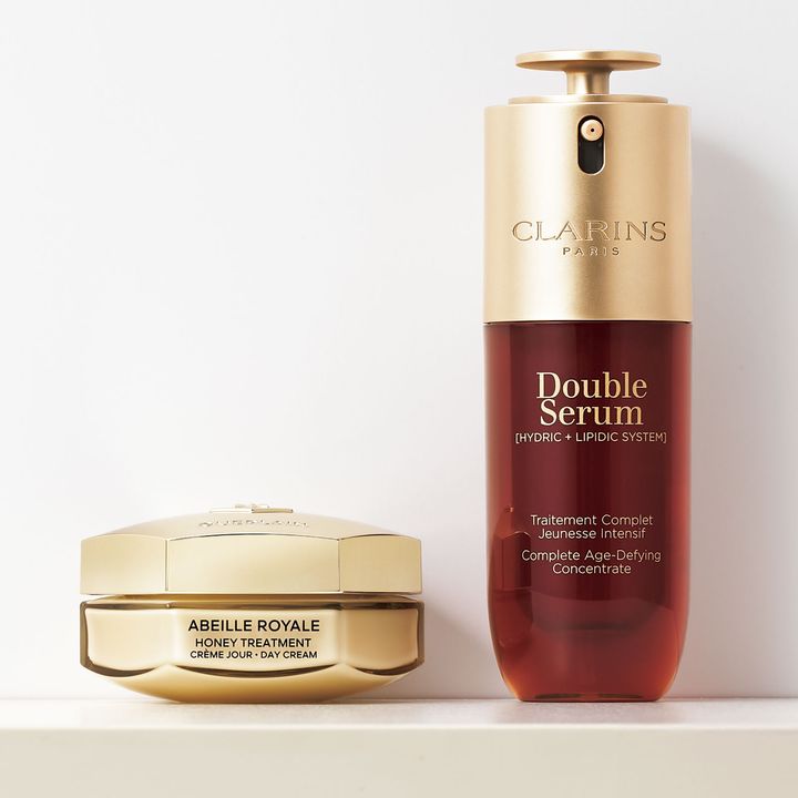 左:厳選されたハチミツの力でハリ肌に。アベイユ ロイヤル トリートメント クリーム 50ml ¥21,780(ゲラン)右:完全比率に配合した水分と油分2相セラムがエイジングサインにアプローチ。ダブル セーラム ADC 50ml ¥17,380(クラランス)