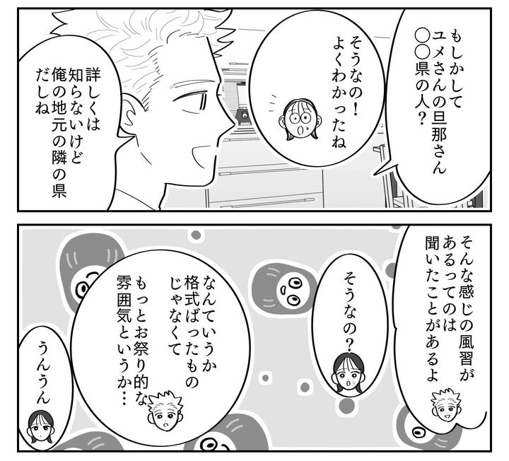 招待状と一緒に会費用の封筒が入っていて、保存容器を持参なんて書いてあって……。私が戸惑いながら説明すると、ソウタからあっさり「もしかして旦那さん、○○県の人?」と返されました。ずばり言い当てられたのでビックリします。