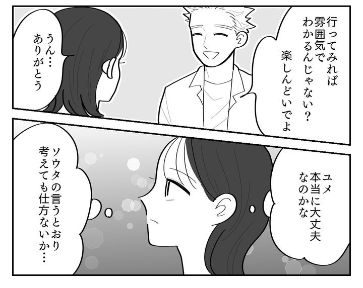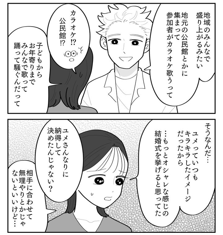 ソウタは隣県の出身ということもあって、ユメの結婚相手の地元をずばり言い当ててきました。そして知っている話を教えてくれました。なんでも形式ばらず、地元のホールや公民館でカラオケを楽しんだりするのが昔ながらの結婚式なんだとか……。