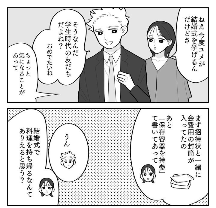 私はアイカ。先日、学生時代の友人ユメから結婚式の招待状が届きました。ユメならきっと都心の結婚式場でオシャレな式を挙げるのだろうと考えていたのですが、招待状に書いてあるのは予想外の言葉ばかり。会場は新郎の地元でものすごく遠方だし、ご祝儀ではなく会費制。しかも「持ち帰り用の保存容器持参」って……。ユメは本当にこの結婚に心から納得しているの? そんな不安が頭をよぎり、私は夫のソウタに相談してみました。