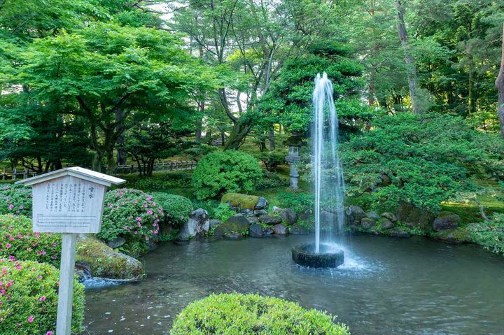 噴水の起源は、古代メソポタミア文明までさかのぼるといわれていますが、日本においては1861年に前田斉泰が金沢城内につくった兼六園の噴水が最古とされています。これは、金沢城二の丸に水を引くために試作されたもので、約5mある霞ヶ池との高低差を利用した逆サイフォン構造になっているのが特徴的。そのため、水の高さは、霞ヶ池の水位によって変化します。