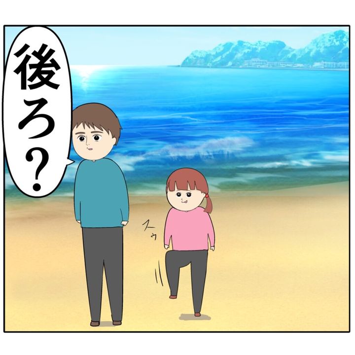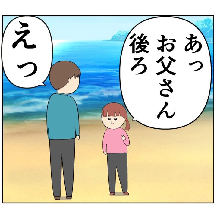 家族の思い出の海に、離婚した元夫ろみ緒さんと娘のあかりちゃんと3人で訪れているめいさん。めいさんが海を見ながらこれまでのことを思い返していると、「あっお父さん後ろ」と突然あかりちゃんがろみ緒さんの後ろを指差しました。