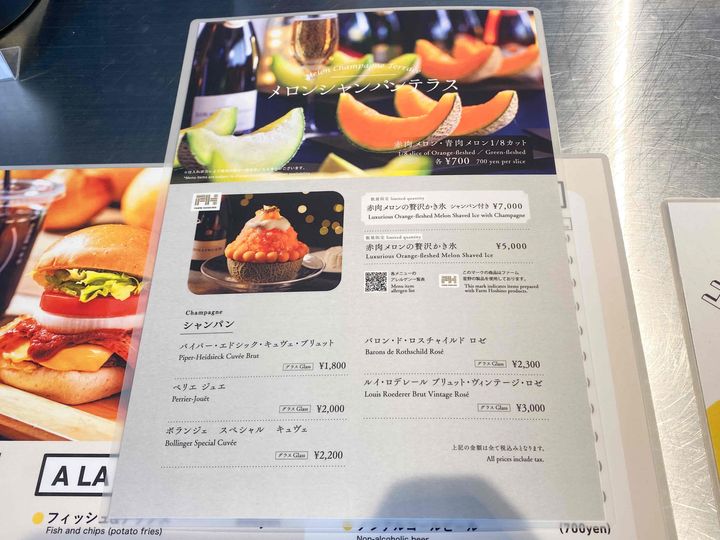 ディナー前だったので、赤肉メロン・青肉メロン1/8カット(各700円)を一切れずついただきました。こちらは「メロンシャンパンテラス」がスタートする16時以降からのみ注文できるのでお気をつけください。