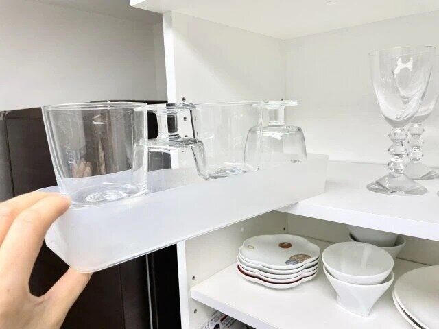 グラスなど背の高い食器を収納するときは手前から奥に向かって同じシリーズを縦に並べるのがおすすめ。