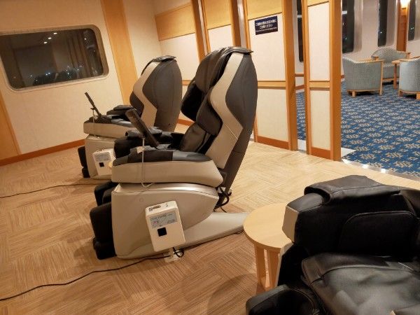マッサージチェアからの缶ビール(※船内レストランで営業時間内のみ販売)で晩酌。