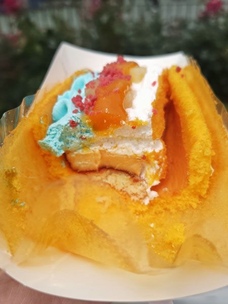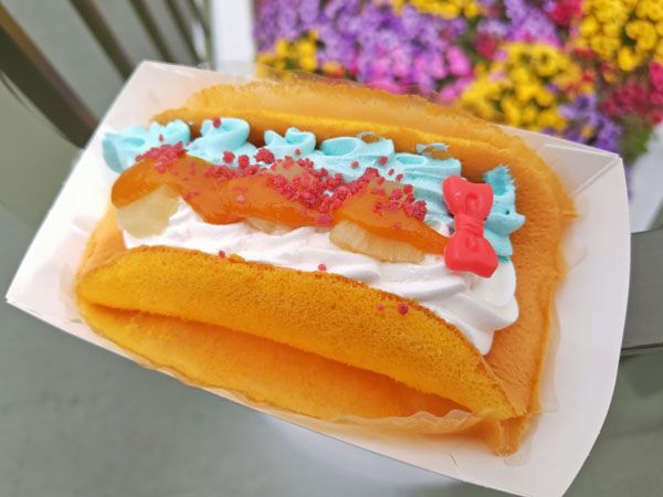 ドナルドをイメージした白とブルーのホイップに、カットパインとマンゴーのソースがのったオムレットロール。リボン型のチョコもアクセントに。実はクリームの下にはプリンが隠れていて、食べ応え十分!