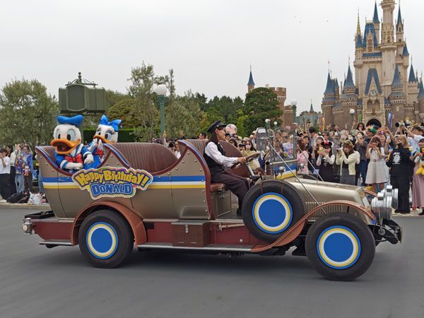 「Happy Birthday! DONALD」の飾りがついたタウンカーの1台目には、主役のドナルドとデイジーダックが乗車。