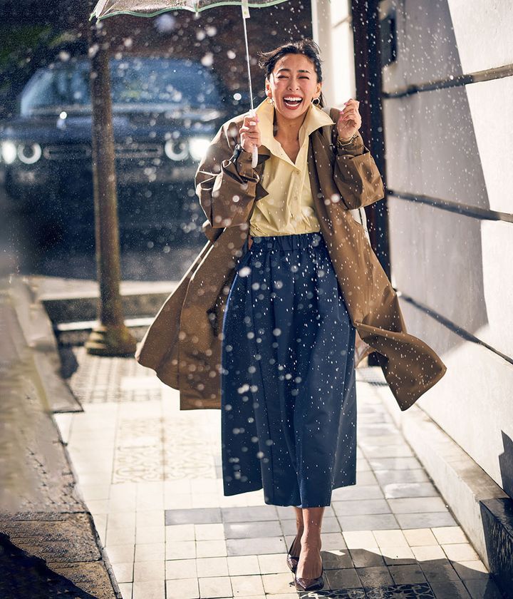 トレンチコート[防水]¥82,500(カオス/カオス丸の内)ブラウス[撥水・速乾・UVカット]¥22,000(ELENDEEK)スカート[撥水]¥66,000(ザ サードマガジン/サードマガジン)バッグ¥8,250(カカトゥ/アンビリオン)パンプス[晴雨兼用]¥18,700(オゥ バニスター/アバハウスインターナショナル オンラインストア)ピアス¥35,200ブレスレット¥83,600(ともにブランイリス/ブランイリス トーキョー)傘¥2,640(Wpc./ワールドパーティー)