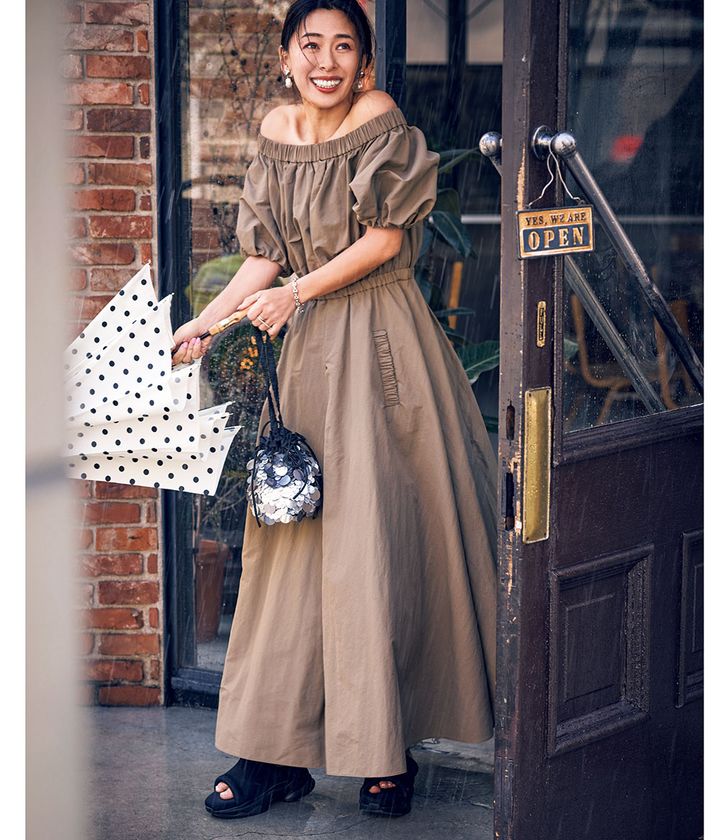 ヘルシーな肌見せが叶う上品なベージュ、清潔感のある盛り袖、歩くたびに波打つたっぷり生地。リッチなムードを纏いながら撥水機能も備えた一着が雨の日のママ友ランチを優雅に彩ります。