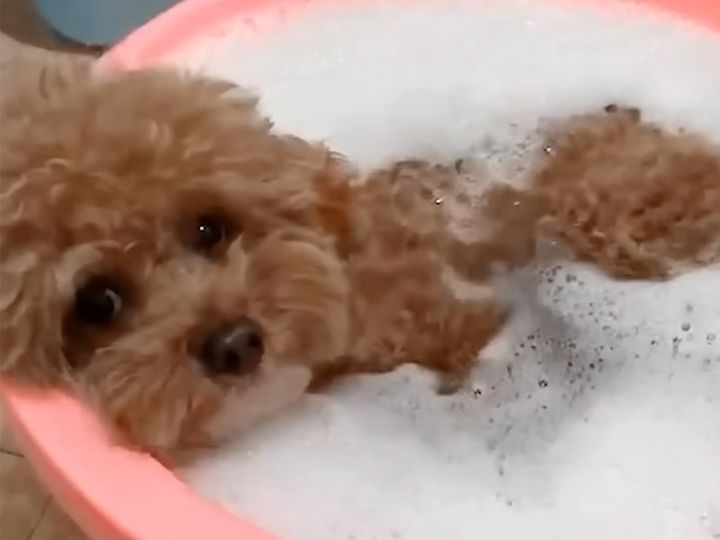 泡風呂が大好き! 優雅なトイプードルの入浴タイム
