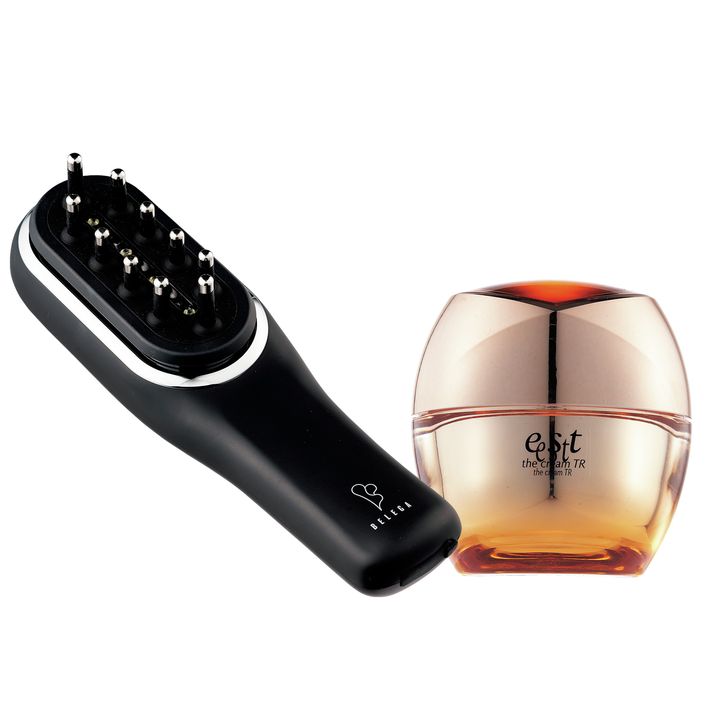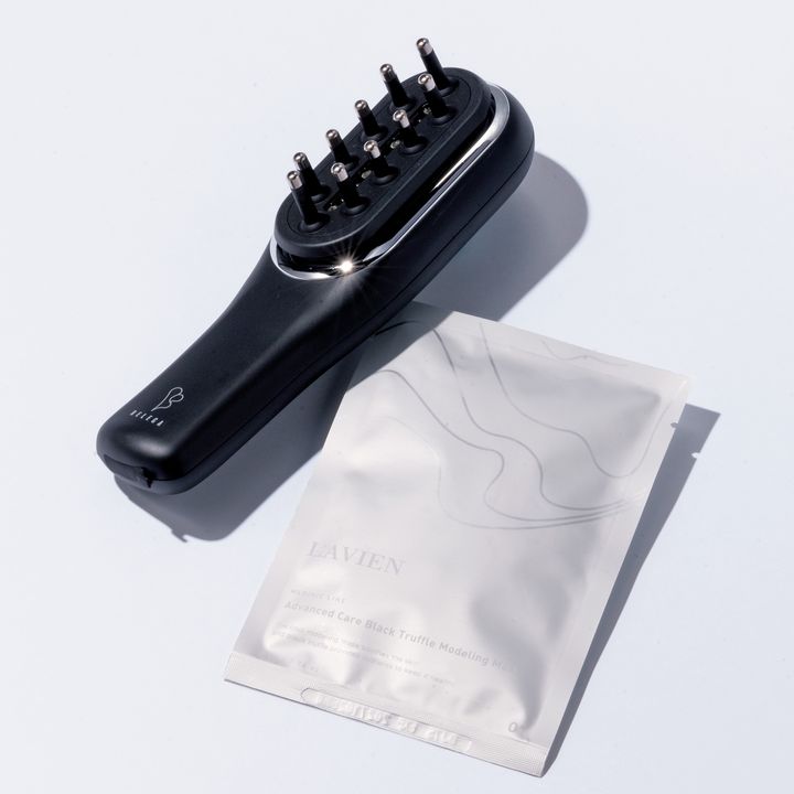 (左から)表情筋を鍛えてハリツヤアップ。セルキュア4T++¥213,400(ベレガ)、老廃物を吸着。保湿力もアップ。2剤を混ぜて使用。アドバンスドケアブラックトリュフマスク1剤・2剤(合わせて55g×5回分)¥6,930(LAVIEN JAPAN)